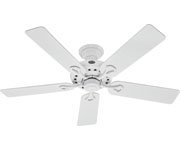 Infused with the charm of timeless tradition, this 20516 52-inch five-blade ceiling fan from Hunter's Savoy collection makes a beautiful addition to any living room, den, master bedroom, or other large room. The ceiling fan features a clean white finish and five white/light-oak blades. In addition to its elegant craftsmanship, the ceiling fan offers reliable operation and cost savings throughout the year. Use it to create a cooling breeze in the summer or to circulate warm air in the winter. The ceiling fan's AVT hanging system makes installation a snap, even for the most novice do-it-yourselfer, while its Installer's Choice three-position mounting system allows for hanging the fan in a standard, flush, or angled position. The ceiling fan offers three speed settings, whisper-quiet performance, and smooth-running operation thanks to its wobble-free canopy and WhisperWind motor. Even more, it's Energy Star rated, which means it operates efficiently, which translates to lower energy costs and reduced impact on the environment. A 3-inch (3/4-inch interior diameter) pole comes included. The UL-listed ceiling fan measures 52 inches in diameter by about 12 inches high and carries a limited lifetime warranty.
